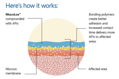 MucoLox’s one-of-a-kind polymer network brings improved moisturization and protection, but won’t easily wash away, bonding to the mucosa to create a powerful but lightweight coating effect. When used with APIs, MucoLox’s advanced adhesive properties help improve contact time of the API to the mucosa.